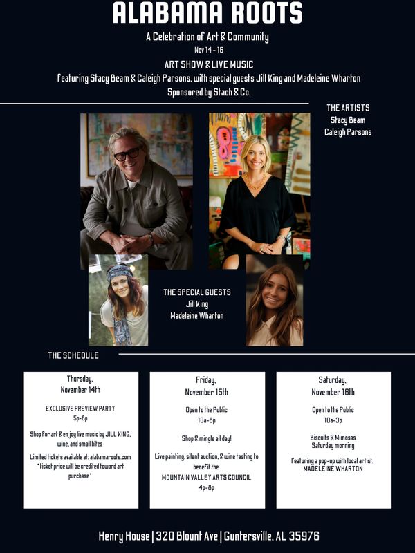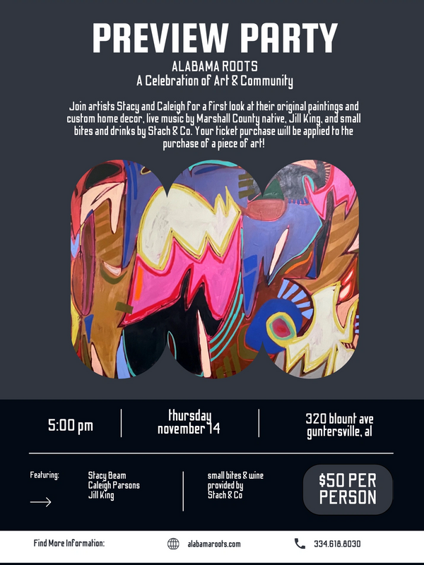 Alabama Roots is a three-day exhibition and celebration of art and community hosted by Stacy Beam and Caleigh Parsons, two artists from Arab, AL. Stacy and Caleigh will be joined by other musicians from Marshall County and will be offering various experiences each day, from live music to live painting, wine tastings, silent auctions, and more. The celebration will take place in Guntersville, AL at the historic Henry House. Mark your calendar to join us! And check out more info below!